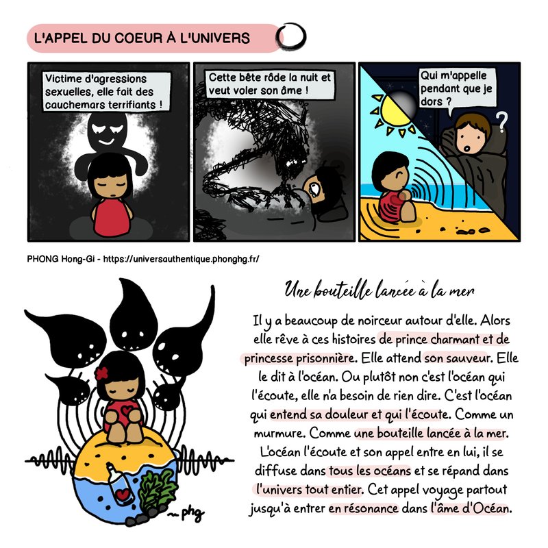 • « Bouteille en voyage » : il s’agit du message intime lancé à la mer, symbole d’espoir et de confiance. Elle représente le cœur qui ose s’ouvrir malgré la vulnérabilité.